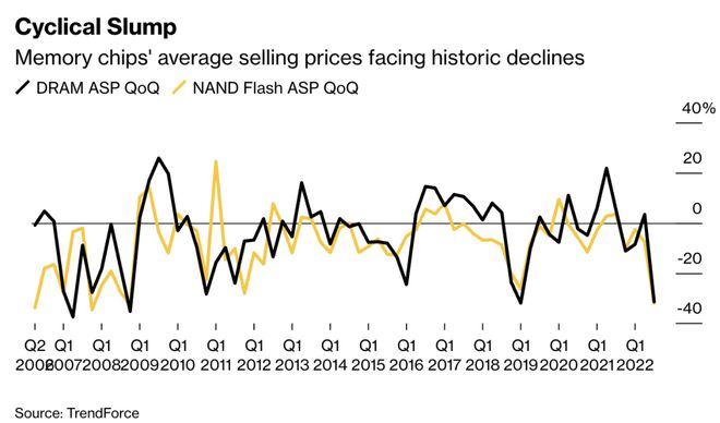 2008-2022年存储芯片平均销售价格变动周期图,数据