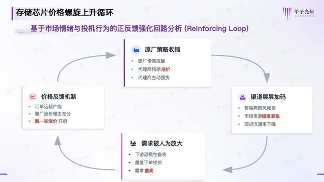「甲子光年」总结了当前存储芯片价格上涨机制:原厂策略性减少供应→代理商预期未来价格会上涨而囤积库存→贸易商随之效仿囤积更多库存加剧现货短缺→下游买家恐慌性购买导致需求虚增→最终形成新一轮的价格上涨循环。