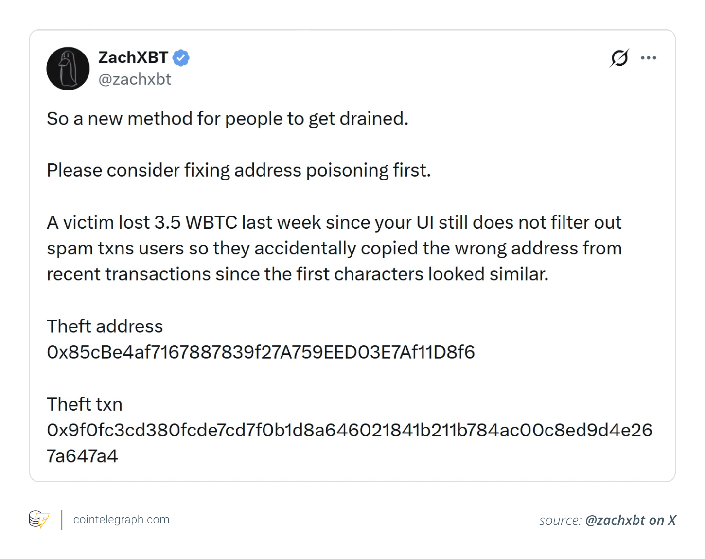 2026年2月发生了一起针对Phantom Chat功能的网络钓鱼攻击事件,黑客利用地址投毒的方式成功窃取了价值超过264,000美元的3.5个Wrapped Bitcoin(wBTC)。