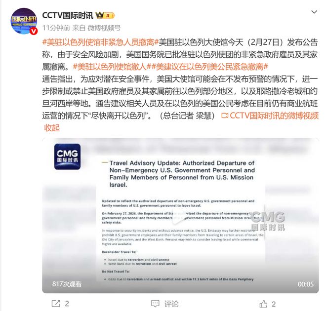 美国驻以大使迈克·赫卡比在当地时间2月27日通知使馆工作人员,如果他们打算离境,应“立即采取行动”。
