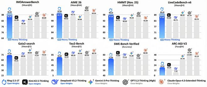 Ring-2.5-1T则在数学、代码及逻辑等高难度推理任务以及智能体搜索、软件工程和工具调用等长程任务上达到开源领先水平。这些性能提升与混合线性注意力架构在处理长依赖关系和压缩状态方面的优势密切相关。