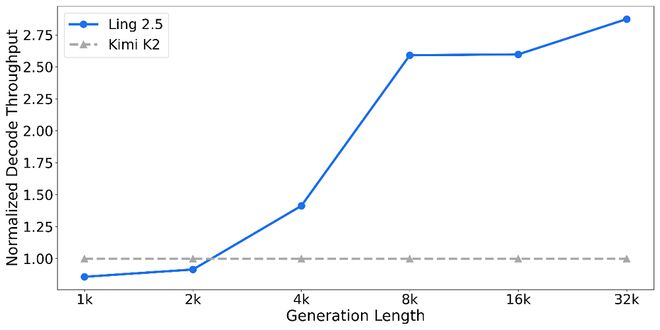 这种架构上的优势也直接转化为工程实践上的红利。即便在激活参数量增加至63B的情况下,基于混合线性注意力的Ling-2.5在单机8卡H200的配置下,其长文本生成的解码吞吐量(decode throughput)仍显著优于前代1T规模模型以及同等参数量的Kimi K2。
