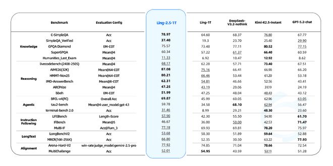 此外,效率提升并未牺牲性能表现。多项基准测试显示,在涉及推理、智能体操作、指令遵循及长上下文处理等场景中,Ling-2.5-1T的性能超越了DeepSeek-V3.2-nothink、Kimi-K2.5-Instant和GPT-5.2-chat等同类型即时模型。