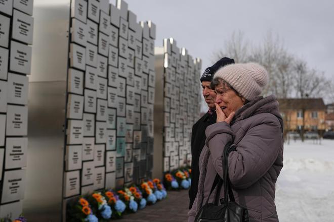 2月24日,在乌克兰布恰的一次仪式上,遇难者亲属在纪念墙前参加活动。