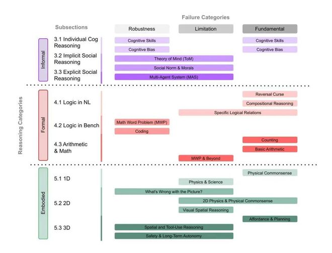 研究提出了一种二维分类体系。一条轴线描述“推理类型”,另一条轴线描绘“失败性质”。通过这一结构,不同领域的研究问题可以在同一个坐标系下被理解和比较。