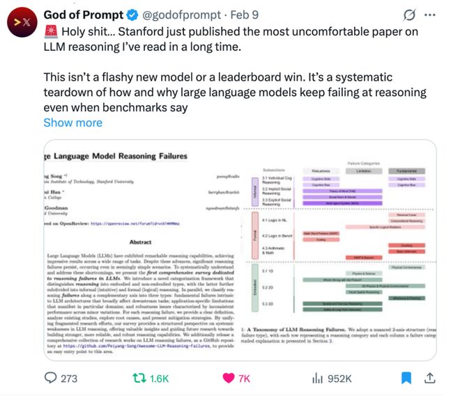 在 X(原 Twitter)平台上,有评论指出这是“近年来最令人不安的大型语言模型推理论文”。这种担忧并非由于提出了夸张结论,而是因为这篇论文系统地梳理了大语言模型在推理方面反复出现的问题模式,而没有展示新的 SOTA 模型或 leaderboard 成绩。