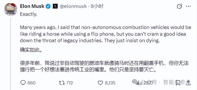 马斯克曾嘲讽福特此举是“自找苦吃”,认为在自动驾驶时代内燃机的运营成本将变得不再经济实惠。