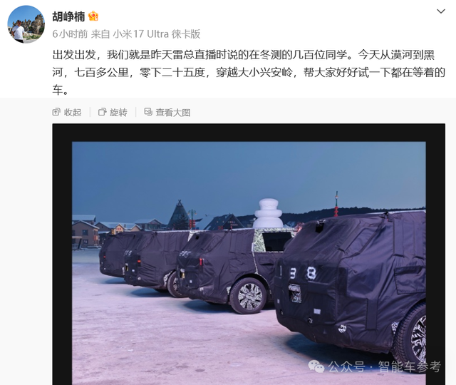 小米从吉利研究院挖来的院长、小米汽车的“关键先生”——胡峥楠,刚发微博晒出了一组伪装测试车的冬测图。
