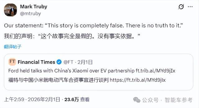福特首席通信官马克·特鲁比在社交平台上发文否认了这一报道,并称其完全无事实根据。