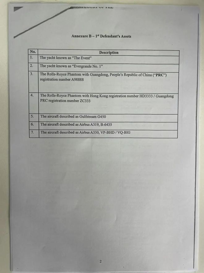 具体而言,中国恒大集团的清盘人接管了包括位于香港、英国和美国在内的多处物业,以及私人飞机、豪车和游艇等资产,比如车牌号分别为粤A98888和HD3333的两辆劳斯莱斯幻影轿车。