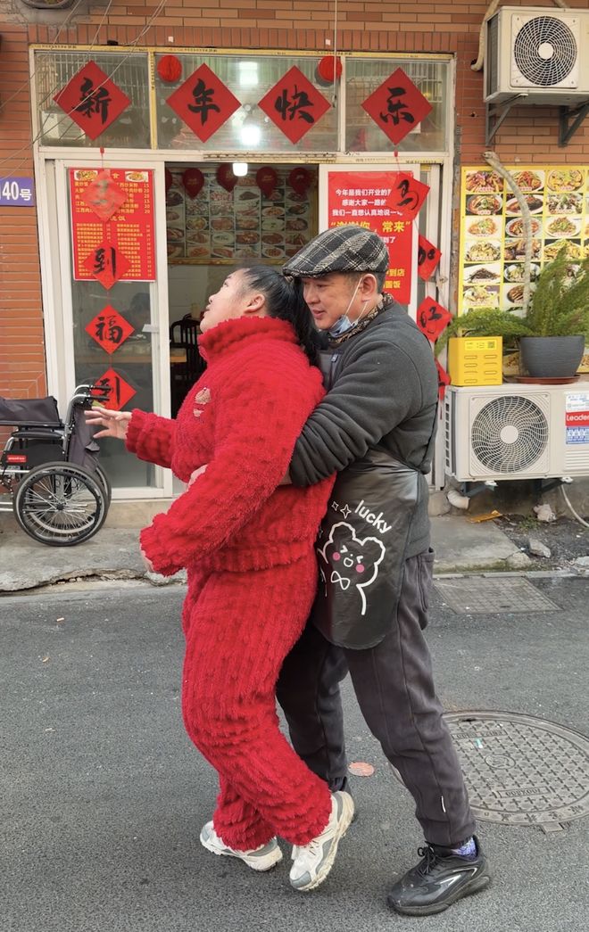 今年23岁的女儿身高一米六几,比袁大姐还要高。由于行动不便,她需要别人抱着练习走路。多年来,彭大哥一直抱她出行。