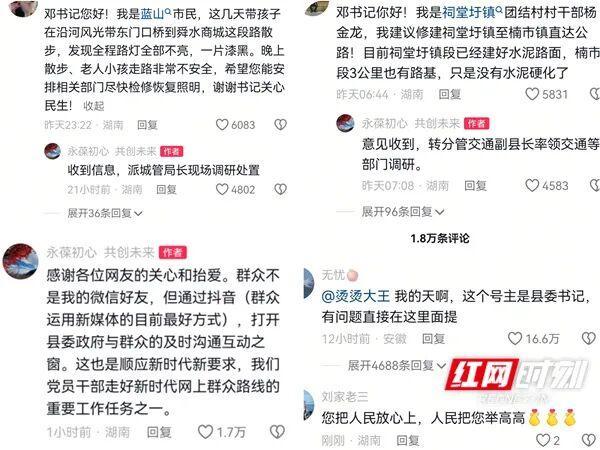 身份从县长转变为县委书记后,虽然职务有所变动但账号一直保留。“很多居民没有我的微信,但是他们都使用抖音,遇到问题可以在这个平台上联系我。”邓群表示,“每天下班或会议结束后,我会抽出时间查看抖音上的留言和评论,回应群众诉求已经坚持了四年半。”