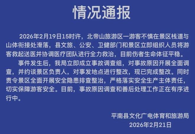 2026年2月19日15时许,北帝山旅游区一游客不慎在景区栈道与山体衔接处滑落,县文旅、公安、卫健部门和景区立即组织人员将游客救起送医并协调医疗团队进行全力救治,目前伤者生命体征平稳。