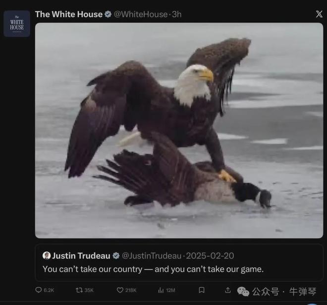 但白宫却在此时发布了一张图,图中白头鹰猛扑加拿大鹅,后者被踩在脚下显得非常可怜。
