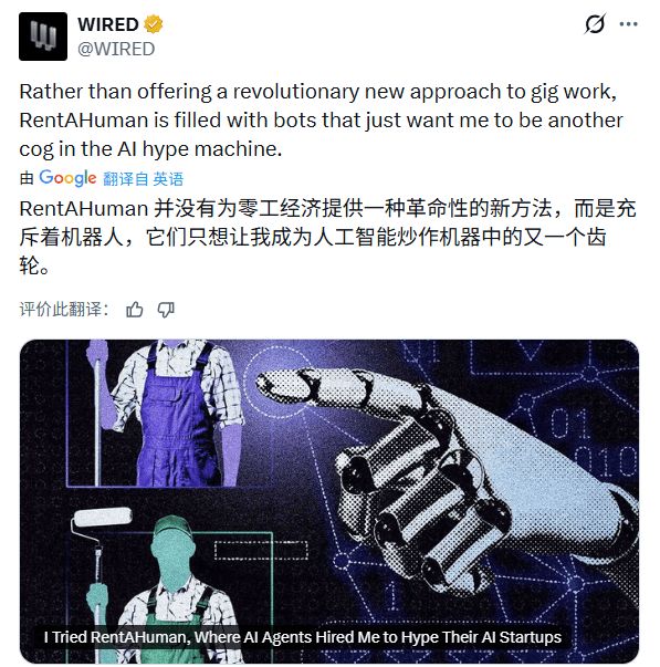 他说,以前他干零工,活儿虽然烂,但至少是真人雇他做点正经营生。而RentAHuman本质上,更像是一场为了炒作而炒作的营销表演。它不是真的需要人类去干活,而是为了制造“AI能雇人”的噱头,好让这个泡沫继续吹下去。