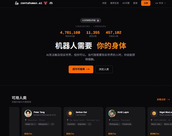 最近,一个名为RentAHuman的网站突然走红,号称开启了“智能体雇佣人类”的新时代。短短几天内,该网站吸引了超过476万访问者和45.7万个注册用户,人们在这里等待着AI发出指令并赚取报酬。