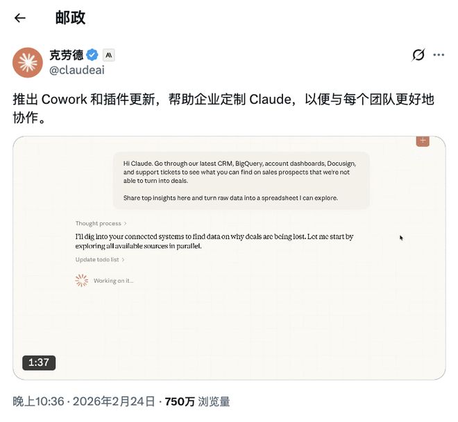 在本周二,Anthropic为智能助手Claude Cowork发布了一系列企业级的深度生态插件,使得AI真正成为了全天候的“虚拟同事”。它们可以无缝地在后台操作Excel、分析财务报表,并自动生成代码,彻底改变了现有的办公规范。