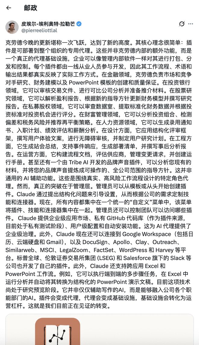 更新后的Cowork不仅可操控PowerPoint和Excel,并且可以连接主流办公套件。Anthropic允许企业建立私有插件市场,将内部GitHub仓库或数据库转化为Claude的知识源。