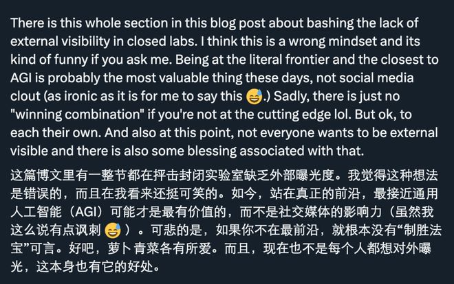 对于批评闭源实验室缺乏外部可见性的说法,Yi Tay 认为这误解了重点:真正的前沿价值在于参与最接近 AGI 的探索而非追求个人知名度。