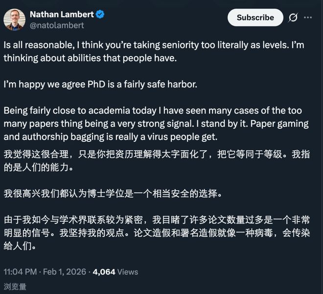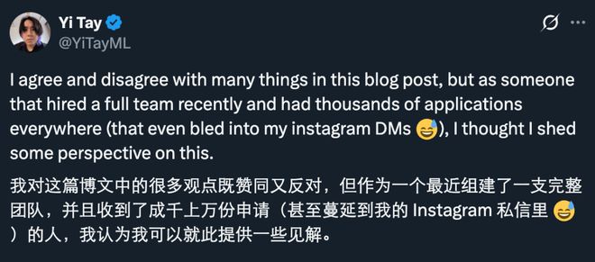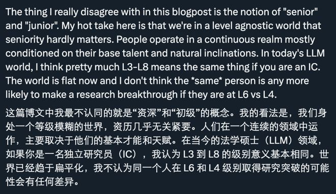 首先,他不同意将“资深”与“初级”的严格区分,认为在当今大型语言模型时代,这种层级标签已经失去意义。个人贡献的价值取决于其天赋和执行力,而不是职级高低。