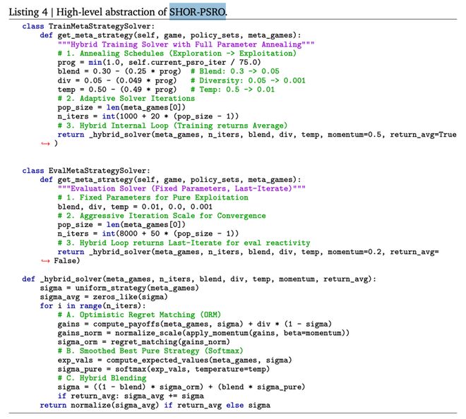 这一过程使AlphaEvolve得以进化出两个新算法:VAD-CFR和SHOR-PSRO。前者在混乱局势中果断舍弃旧经验,后者则采用前期大胆试探后期精准收网的策略,并且训练和测试阶段使用不同的方法。