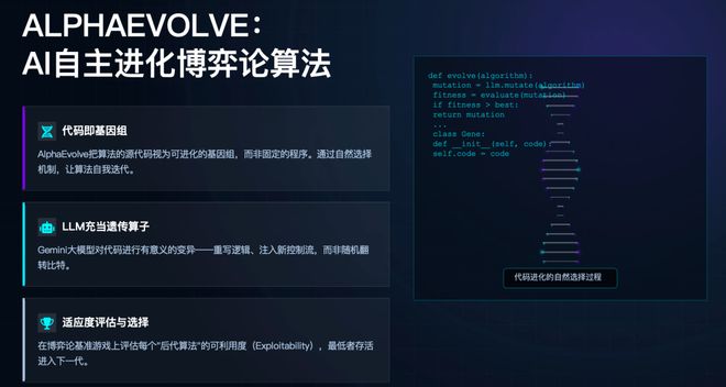 然后他们放出了一个AI(AlphaEvolve),让它像大自然培育物种一样,不停地改写这些规则、测试效果、淘汰差的、留下好的。