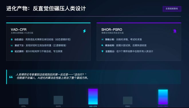 第一套叫VAD-CFR,它学会了三件人类教练从来没想过的事:局势混乱时果断忘掉旧经验,发现好招时立刻加倍下注,前500轮纯学习不做总结。听起来很奇怪对吧?但它就是比所有人类设计的方法都好用。