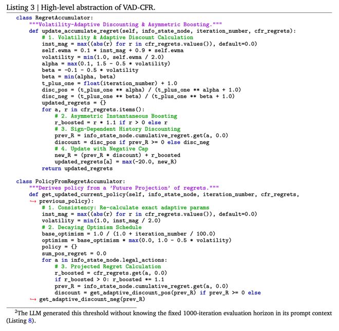 「我们的结果表明,自动发现的算法不对称性——特别是那些管理遗憾缩放和动态混合调度的机制——能够产生对人类直觉而言难以捉摸、但在实践中极其有效的求解器。」