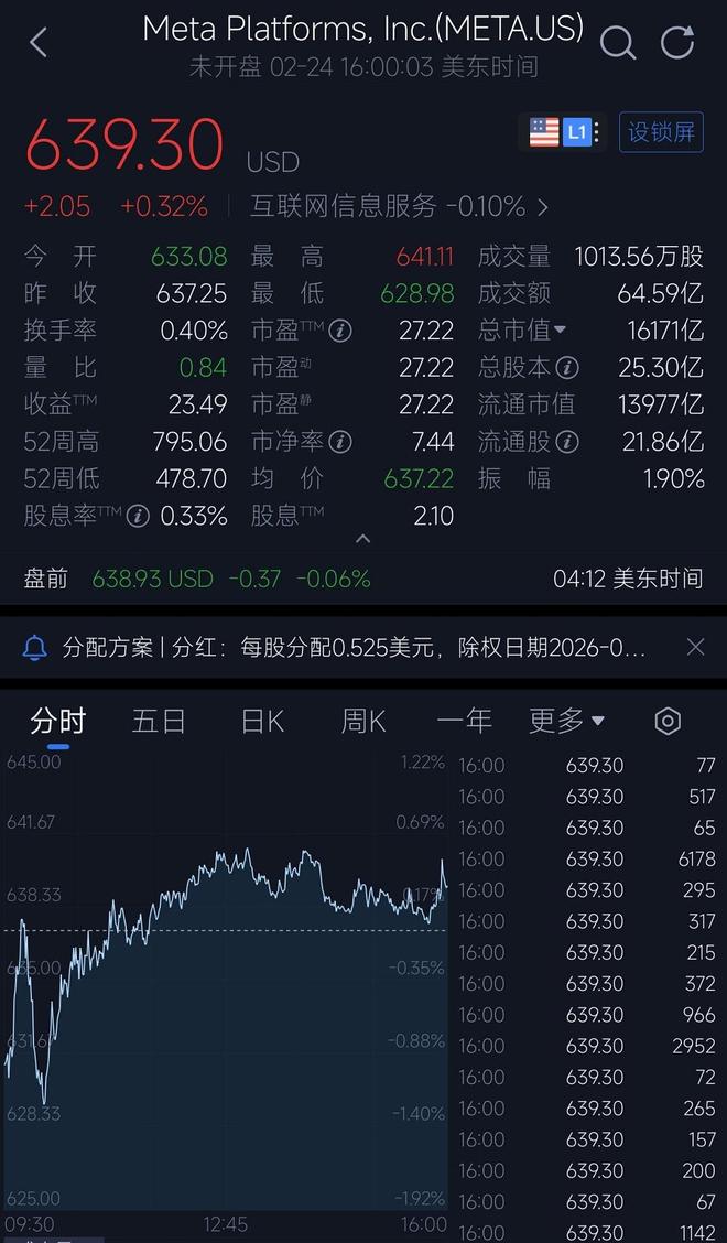 Meta的股票价格也有所上升,在美东时间同一天内上涨了0.32%,以639.30美元的价格收盘。