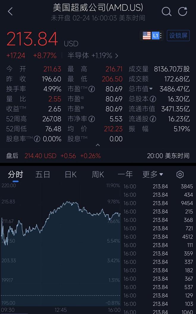 合作消息公布后,资本市场迅速作出反应。在美东时间2月24日收盘时,AMD股价大幅上涨8.77%,报收于每股213.84美元。