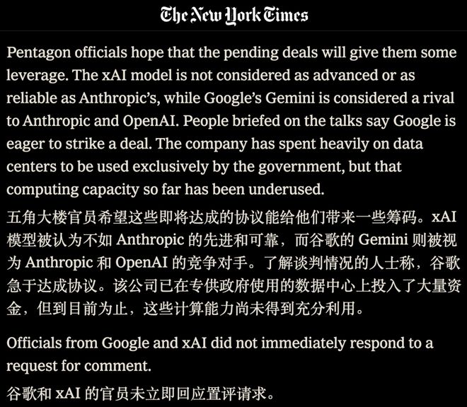在这种高压态势下,xAI 的模型 Grok 获得授权进入机密系统并接受军方标准,成为了五角大楼向 Anthropic 施压的有利筹码。