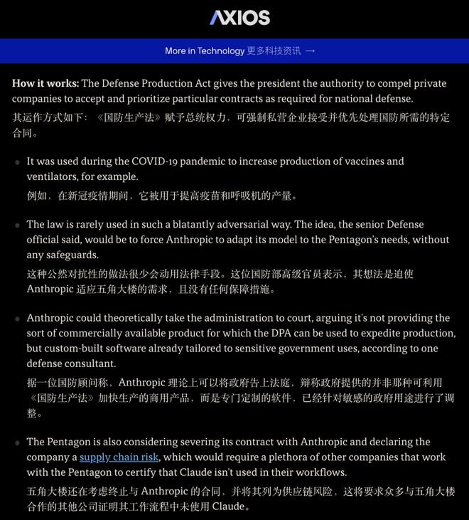 如若拒绝,国防部将考虑动用《国防生产法》强制修改代码,或者直接标记为供应链风险,使其与军方及其他联邦承包商断绝商业往来。