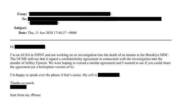据报道,这封邮件的发送时间是2020年6月11日。其中一名自称“AUSA in EDNY”的发件人——可能是“纽约东区联邦助理检察官”这一职位的简称——提到了对爱泼斯坦死亡事件作为“谋杀案”进行调查的情况,并表示自己正在处理布鲁克林大都会拘留中心中一起囚犯死亡案件。
