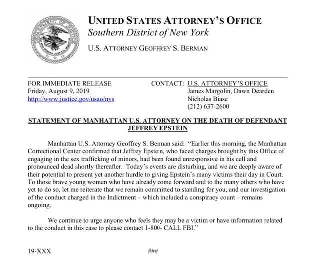 此外,美国司法部公布的最新文件中还包括一份由纽约南区联邦检察官办公室起草、日期为2019年8月9日(即爱泼斯坦死亡前一天)的声明草案。这一发现引发了公众对他的死因产生新的疑问。