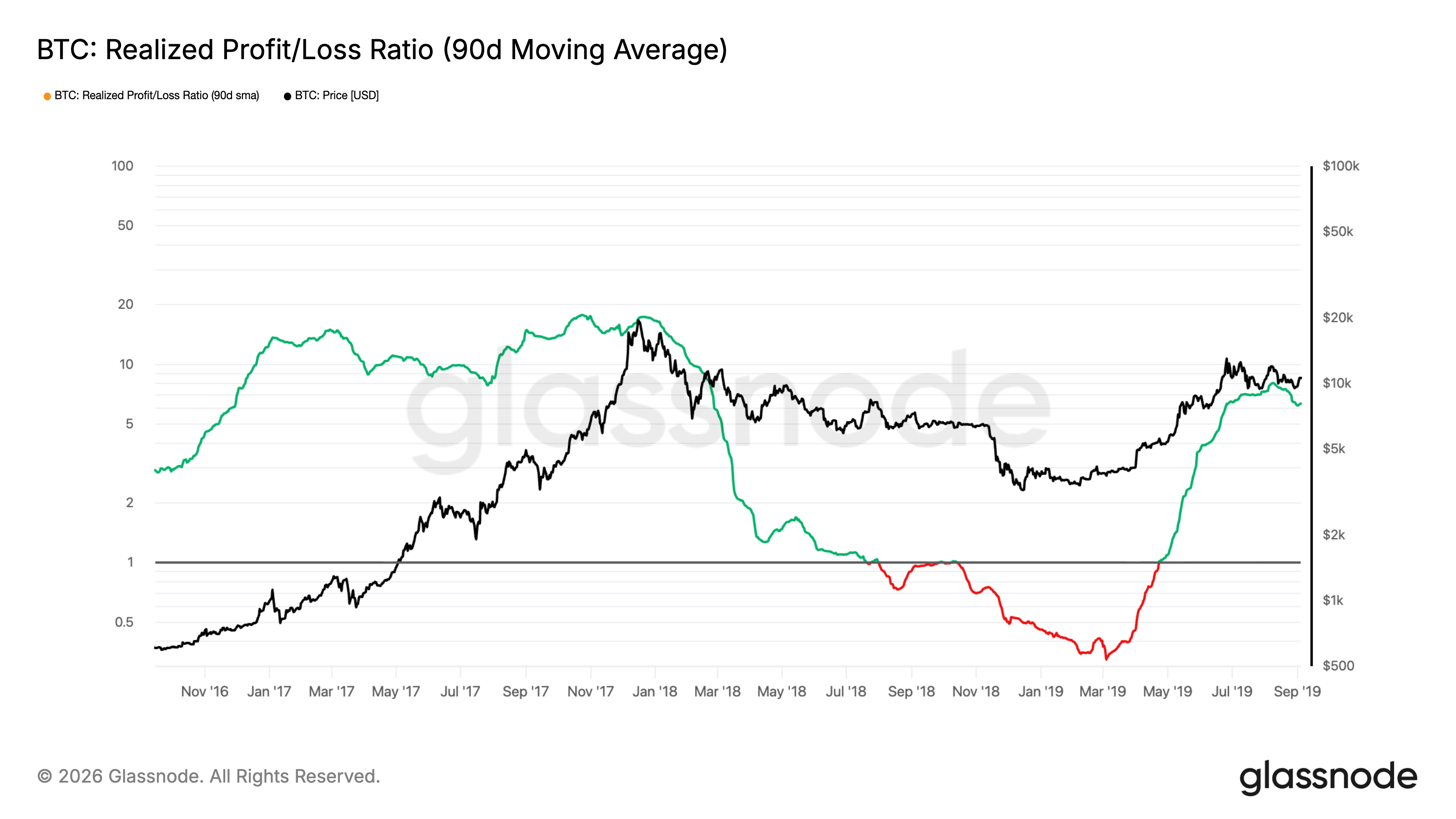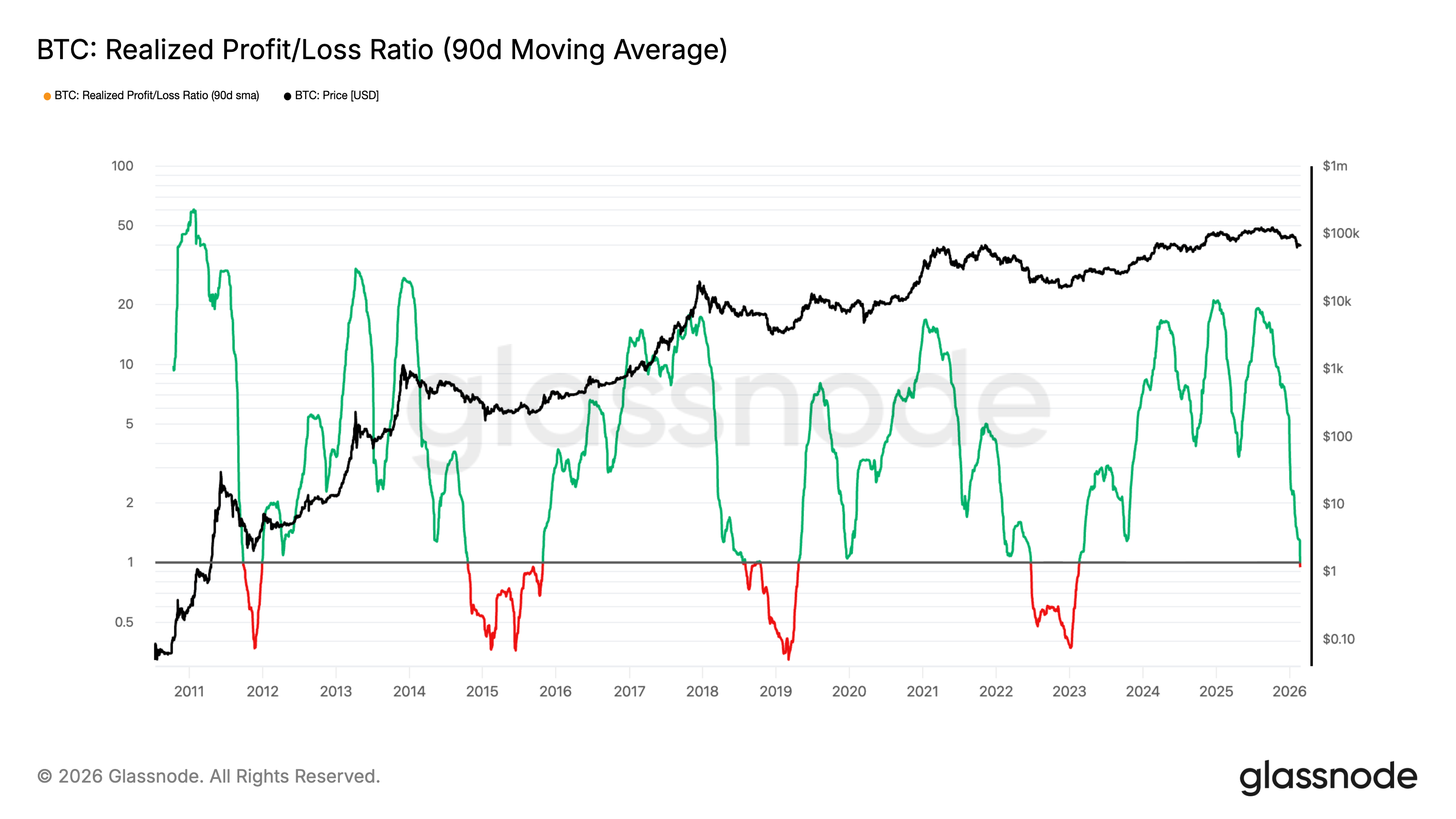 周一的数据显示,比特币90日移动平均线实现盈亏比率已跌破1。
