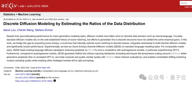 于是,在2023年,他们发表了一篇关键性论文《Discrete Diffusion Modeling by Estimating the Ratios of the Data Distribution》,介绍了一种名为Score Entropy Discrete Diffusion models(SEDD)的新方法。