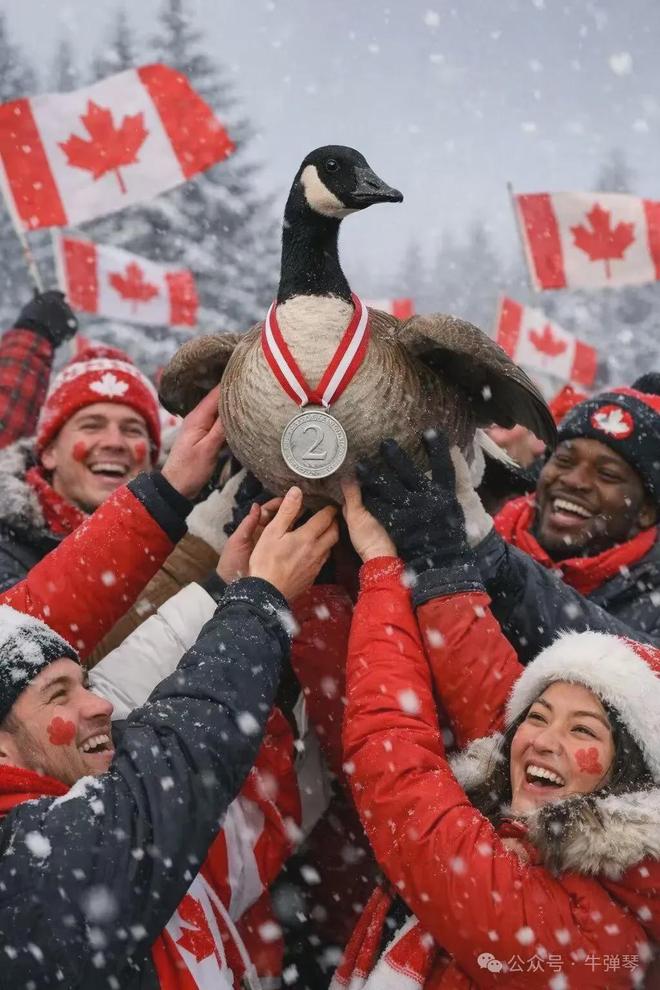 面对侮辱,加拿大人用创作照片的方式回应:高举被踩在脚下的大鹅,并为它戴上银牌,以此表达对特朗普的反击。