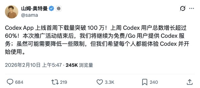 他在本周一的推文中总结:“Codex App上线首周下载量突破100万!上周用户总数增长超过60%!”