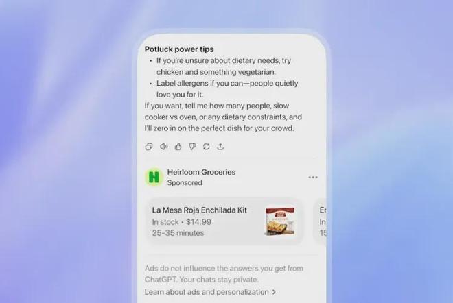 比如当你询问“今晚吃什么?”并搜索食谱时,在回复下方可能会出现一个生鲜电商或半成品菜肴的链接。OpenAI强调,广告内容将与你的对话紧密相关。