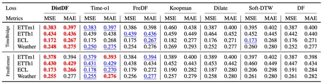 论文还测试了 DistDF 在不同神经网络架构上的表现,包括 TimeBridge、FredFormer、iTransformer 和 FreTS 等,证明其与模型无关特性:能够显著提升大多数主流预测模型的精度。