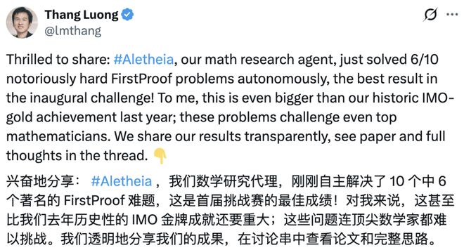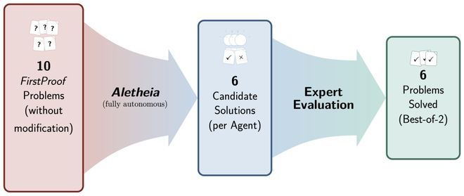 最近,由谷歌DeepMind研发、采用Gemini 3 Deep Think模型驱动的最新数学研究AI系统Aletheia,在首次举办的FirstProof挑战赛中,成功解决了其中10道高难度问题中的6道,创造了该赛事的最佳纪录。