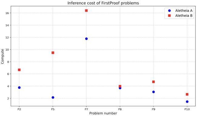 每个候选解的推理成本被表示为相对于Erdős-1051解答推理成本的倍数。可以看到,在所有问题上,Aletheia的推理成本都高于Erdős-1051。