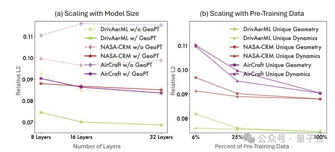 此外,随着模型层数增加和预训练样本数量的增长,GeoPT在性能上持续提升,显示出构建“大尺度物理模型”的潜力。