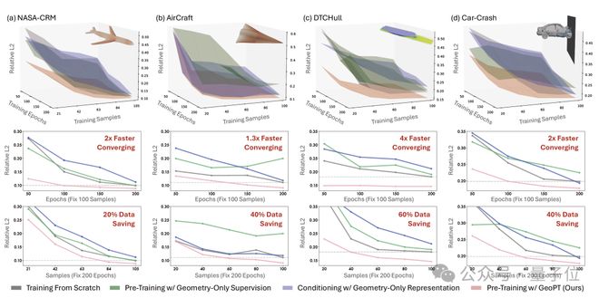 实验结果表明,GeoPT显著减少了对标注数据的需求,在相同精度下节省了20-60%的物理仿真数据量。同时,在微调阶段,模型的收敛速度比从头开始训练快两倍。