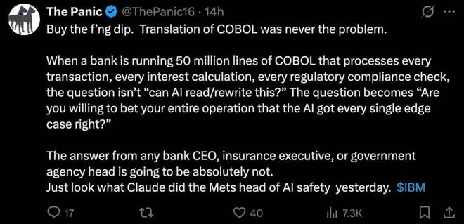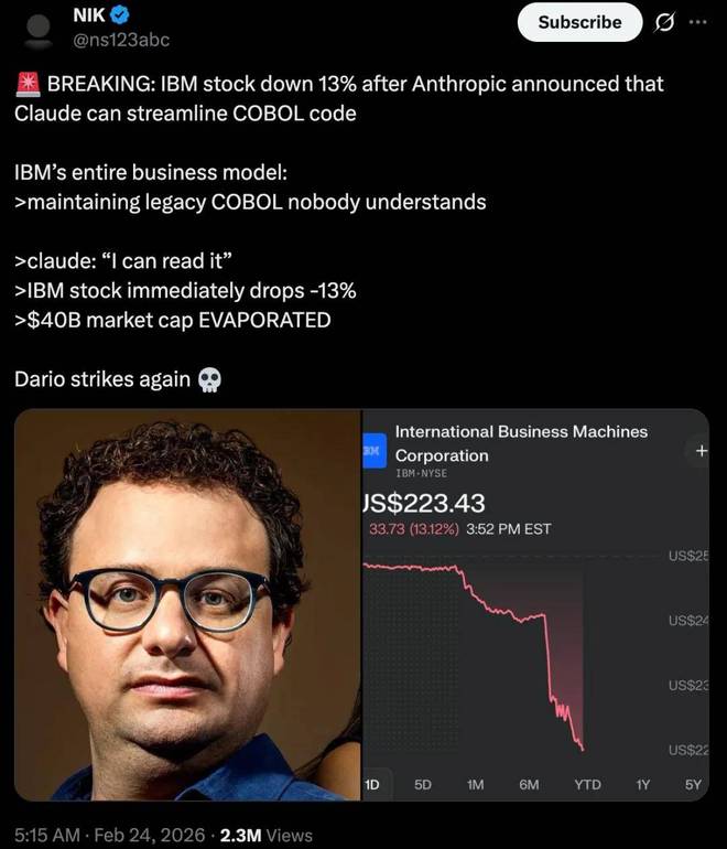 市场对此反应强烈,IBM 股价随即遭受打击。投资者担心一旦 AI 技术能够以更低的成本实现 COBOL 的现代化迁移,IBM 长期依赖的咨询服务和大型机锁定效应将会大大减弱。