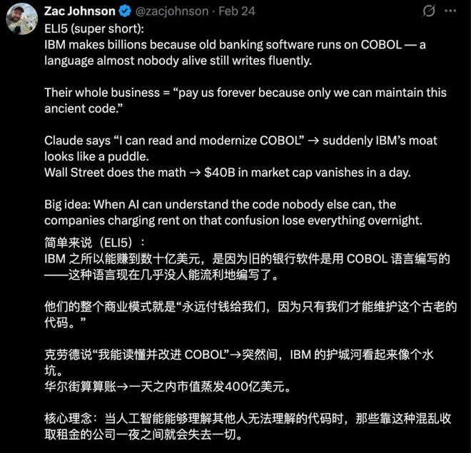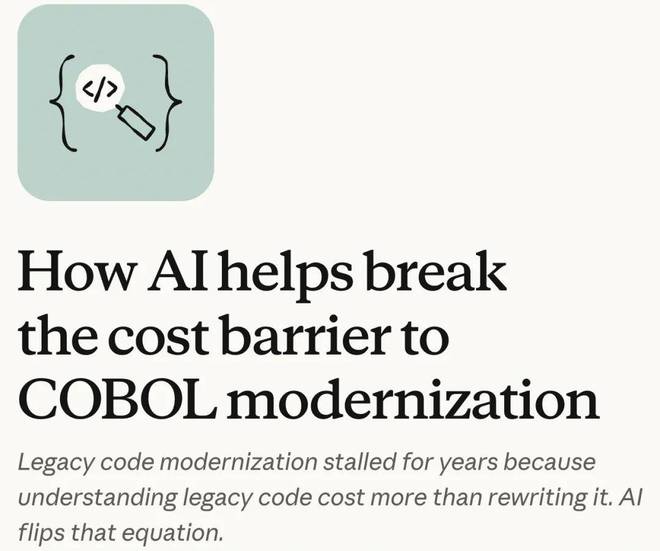 这场风波的起因是 AI 初创公司 Anthropic 发布了一篇博客文章,文中介绍了其 Claude Code 工具如何自动化地将 COBOL 代码进行现代化迁移的功能。
