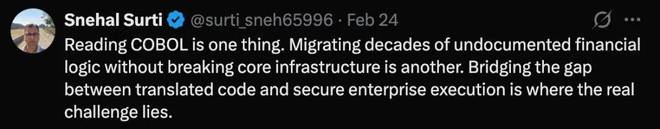 系统设计师 Snehal Surti 则指出,阅读 COBOL 代码是一回事,在不破坏核心基础设施的前提下迁移数十年未记录的财务逻辑则是另一回事,真正的挑战在于如何确保翻译后的代码能够在企业级环境中安全执行。