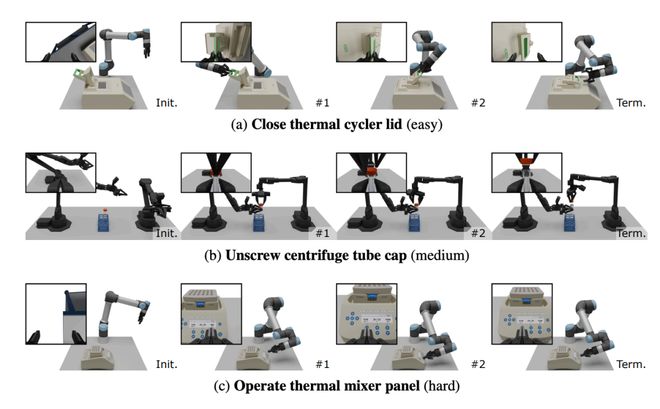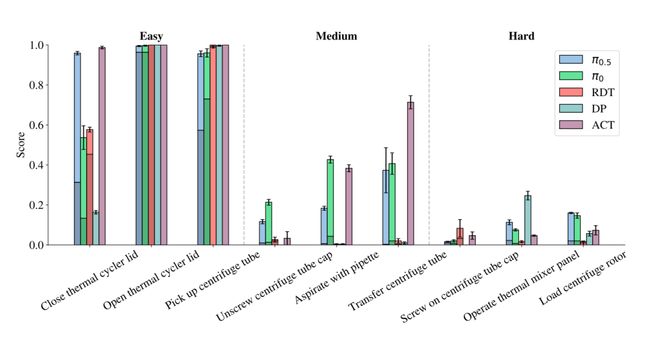 - 中等任务:需要一定精度和语言理解能力,如拧开离心管、样本转移;