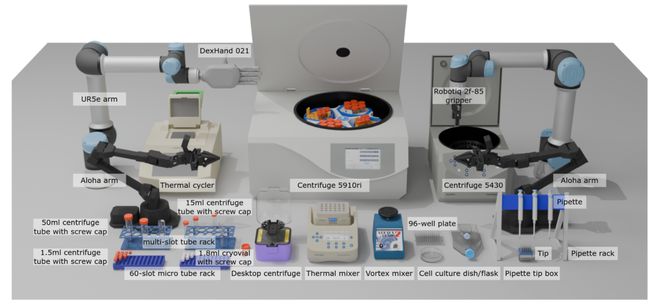 目前对 VLA 模型的研究和测试大多集中在家用场景(如摆放餐具、折叠衣物),而对于专业科学环境,特别是生物实验室的应用则较少探索。生物实验室因其流程结构化、操作精度高以及多模态交互复杂等特点,是评估 VLA 模型在精确操作、视觉推理及指令执行能力方面的理想场地。