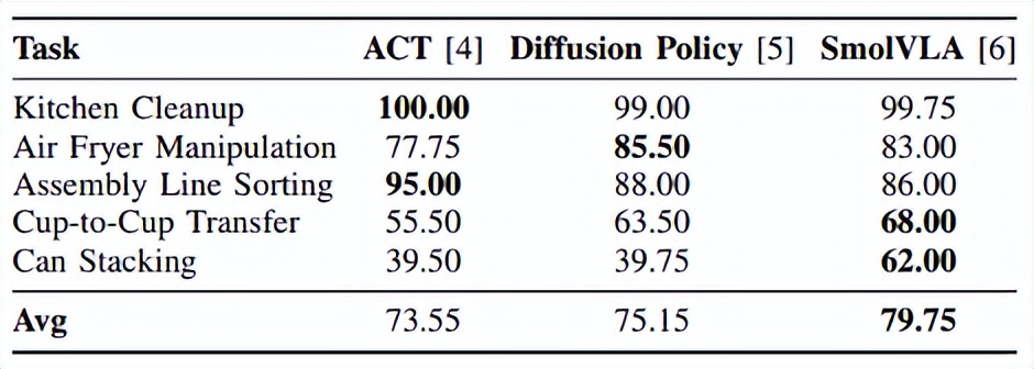 上表:各VLA模型在各项任务中的成功率(%)对比,最佳结果以粗体标出。